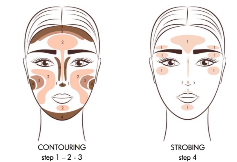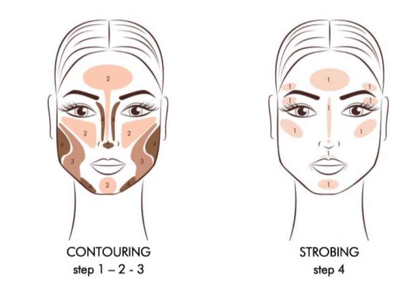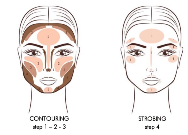 Per questo tipo di viso l’obbiettivo del contouring e dello strobing e quello di bilanciare la sproporzione tra fronte e mento.